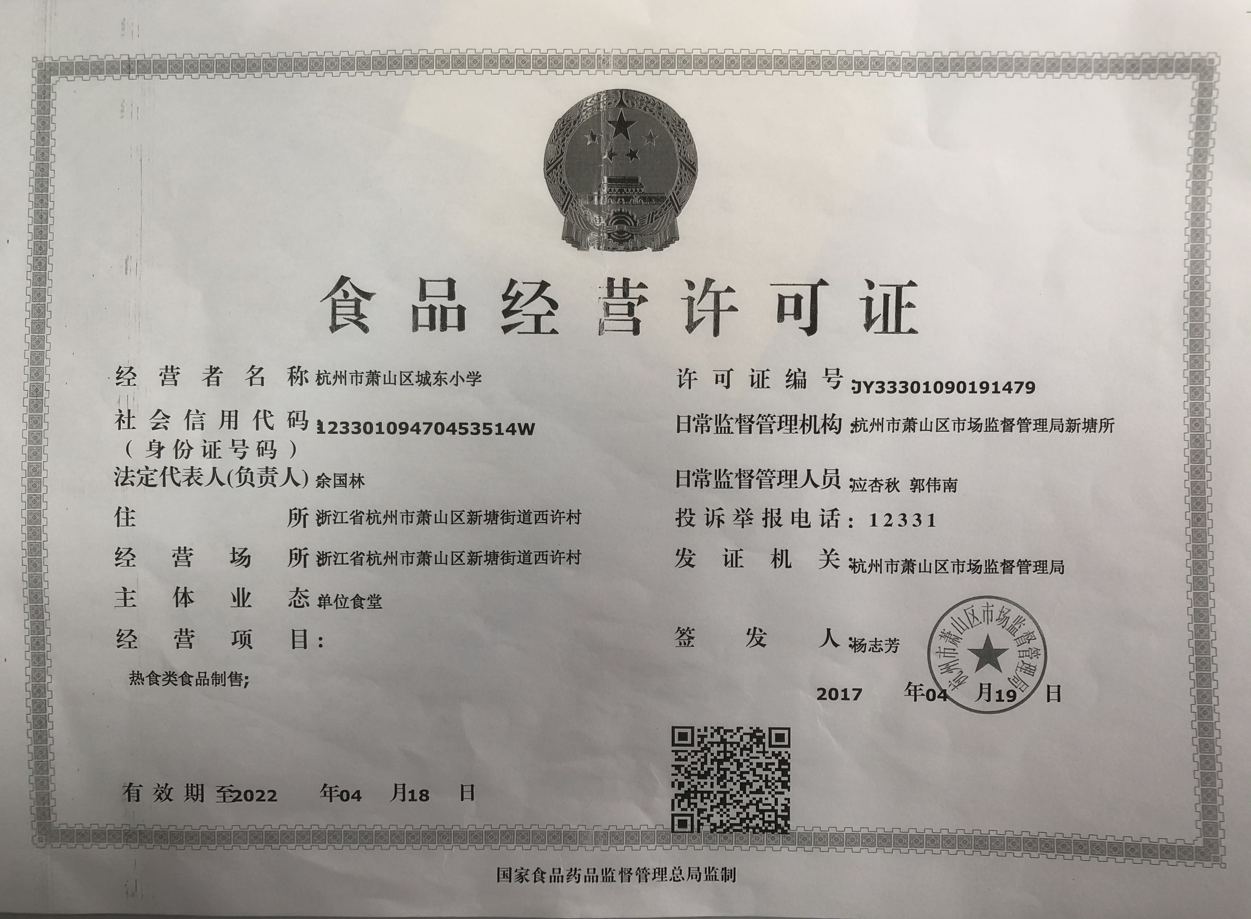 [餐饮许可证]萧山区城东小学教师早餐